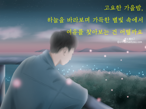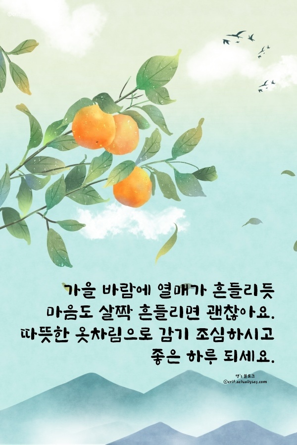 - 선선한 공기가 새 옷처럼 어깨에 걸립니다. 숨을 길게 들이마시고 내쉬면, 걱정도 서서히 가벼워지죠. 오늘은 완벽보다 진심을, 속도보다 리듬을 선택합시다. 가을이 주는 평안이 당신 곁에 오래 머물길 바라요.